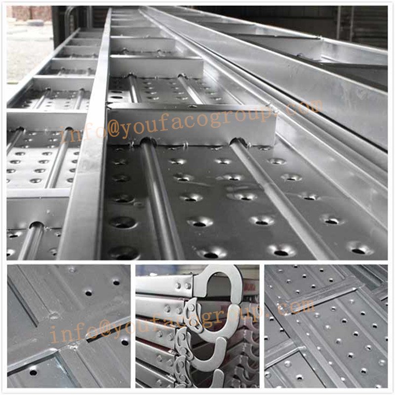 - Scaffolding steel plank is compatible with various types of scaffolding system,fastened scaffolding ledger with 2 hooks on each end.